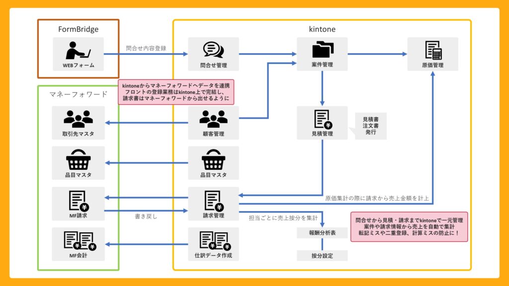 そこで、問い合わせから請求までを一元管理できる仕組みを構築するため、kintoneとマネーフォワードクラウドの連携システムの構築を決定した。